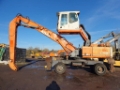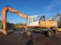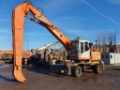 Good condition wheeled material rehandler with hydraulic high rise cab, solid tyres, magnet gear fitted and long reach rehandling arm