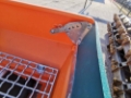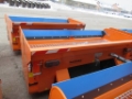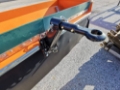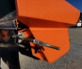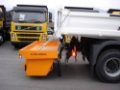 The spreader is mounted to the vehicle using guide chains and a towing hitch, while loading is performed by tipping the truck bed.